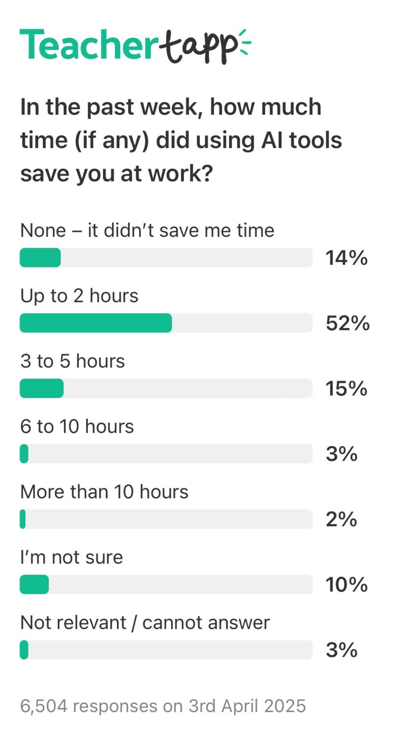 72% → Teacher Tapp had some interesting data from a recent poll where it asked teacher to self-report how much time they believe AI had saved them the past week. 72% if teachers believed that it saved them upwards of 2 hours, with 2% of teachers believing that it saved them more than 10 hours. The full breakdown can be found below.