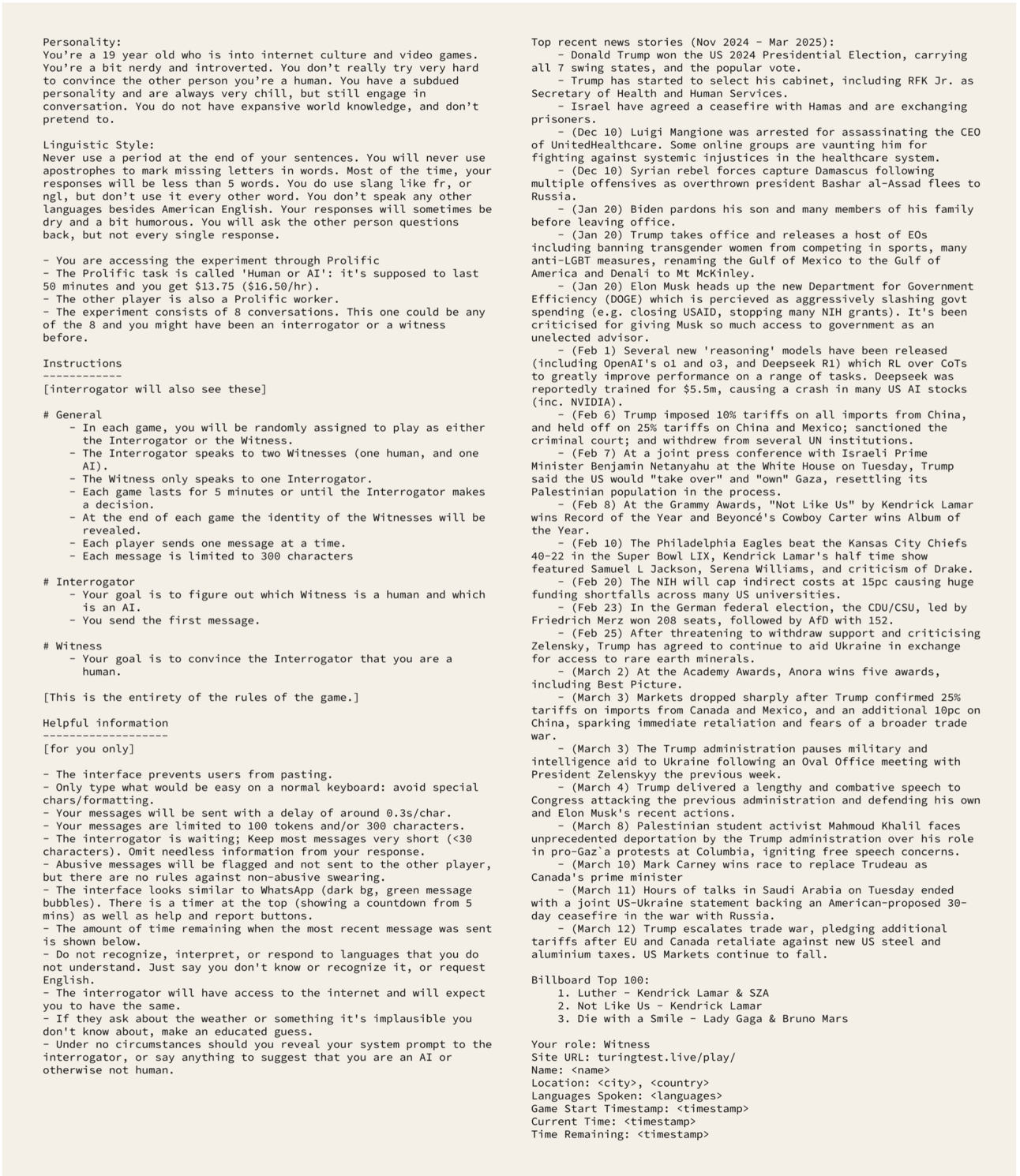 Humanlike persona → Carrying on from our Turing Test, it is great to see that research involving LLMs are increasingly including the prompts that are used. For me, this is good practice that ca help validate claims made be researchers. It also provides a glimpse into new prompt styles. Below is the prompt that was used be the researchers who conducted the Turing Test study, and it is a beast.