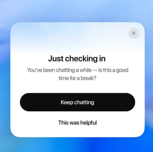 Take a Break Prompt > In an attempt to improve the mental health of users when it comes to prolonged AI interaction, Open AI have now launched a new system reminder that asks you to ‘take a break’ if you have been engaging in conversations for a long time. It will also improve signs of emotional distress within chats and respond appropriately.