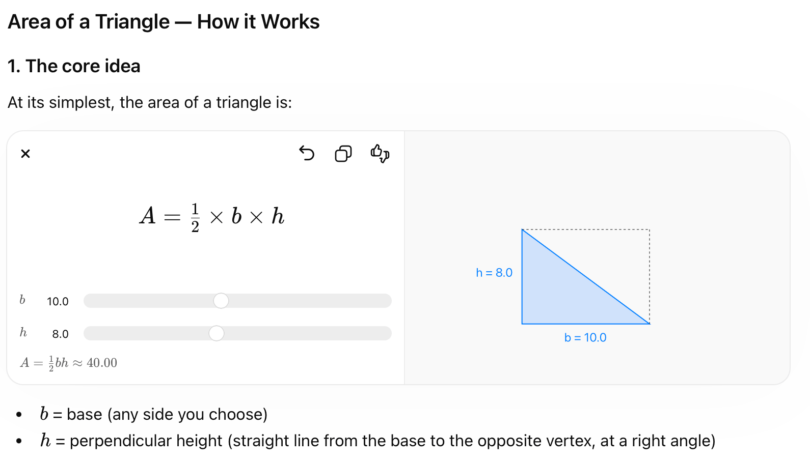 Last week I mentioned that ChatGPT was getting some interactive tools. Well it now seems that those are live. I asked it to explain the area of a Triangle and a very basic interactive widget appeared. You can control the base and the perpendicular height using the sliders. It could be useful for some live modelling where static images just do not quite do it. Unfortunately, I cannot add videos directly into these, but you can see an image of what this looks like below.